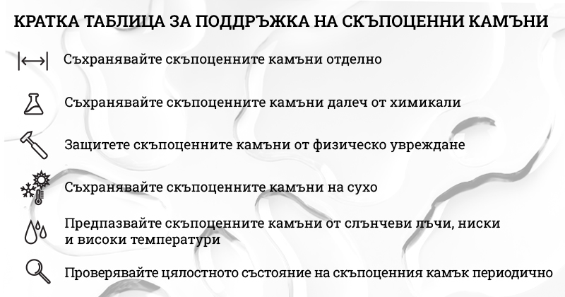 Не забравяйте, че красотата и стойността на всички скъпоценни камъни зависят от начина, по който се грижите за тях и ги съхранявате. Внимателните грижи със сигурност ще ви помогнат да запазите вашите скъпоценни камъни и бижута блестящи и дълготрайни.