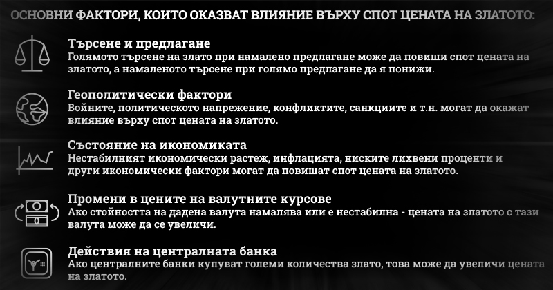 Трябва да се отбележи, че тези фактори са само малка част от многото, които могат да повлияят на спот цената на златото. Пазарът на злато е сложен и променлив и колебанията на цените често се отразяват на взаимодействието на различни пазарни фактори.