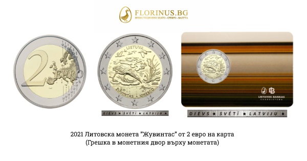 Възпоменателна монета от 2 евро за биосферния резерват ЖувинтНе само малките държави могат да се похвалят с едни от най-популярните и ценни монети. Литва също може да се похвали с тази титла, като монетата ѝ от 2021 г. е посветена на биосферния резерват Жувинтас. По погрешка в обръщение са пуснати до 10 % от тиража, т.е. до 500 монети с грешка в надписа на ръба. Вместо литовския надпис LAISVĖ * VIENYBĖ * GEROVĖ *, на ръба има латвийски надпис DIEVS * SVĒTĪ * LATVIJU.