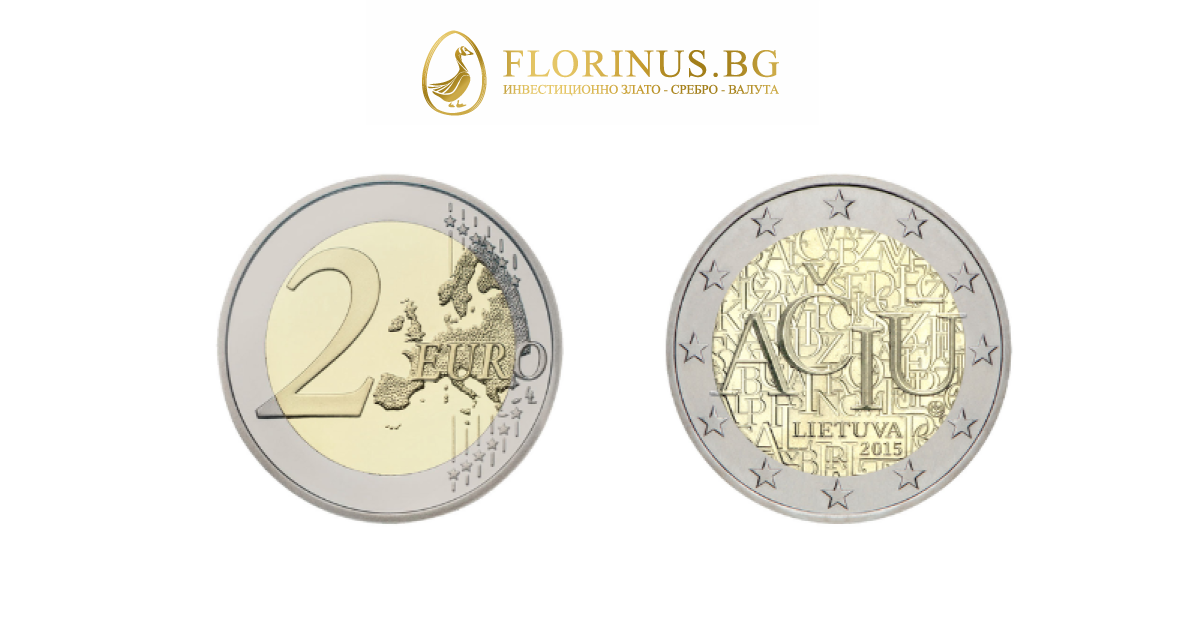 Първата литовска възпоменателна монета от 2 евро е емитирана от Банката на Литва през 2015 г. Монетата е с тираж от 1 милион екземпляра, посветена е на литовския език и на лицевата страна е изписана думата "AČIŪ".