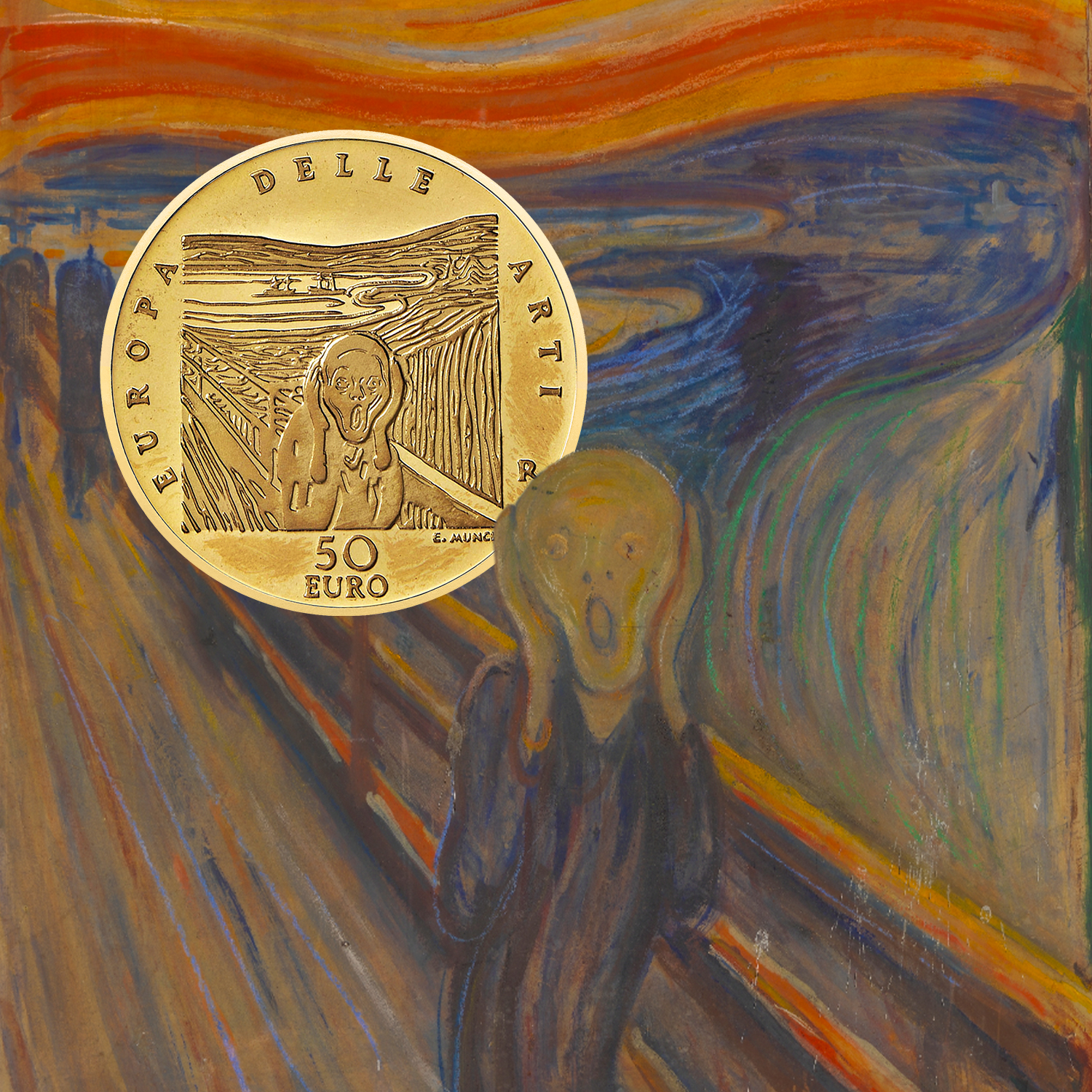 Apie monetą: 2007 m. Italijoje nukaldinta 50 eurų auksinė moneta, priklausanti serijai „Europos menai“. Ši serija skirta Europos kultūros ir meno paveldui, o ant šios monetos pavaizduotas vienas iš žymiausių ekspresionizmo simbolių – Edvardo Munko „Šauksmas“. Moneta pagaminta iš 90 % aukso, jos svoris – 16,13 g, skersmuo – 28 mm. Tai kolekcinė, neapyvartinė moneta, labai vertinama kolekcionierių.