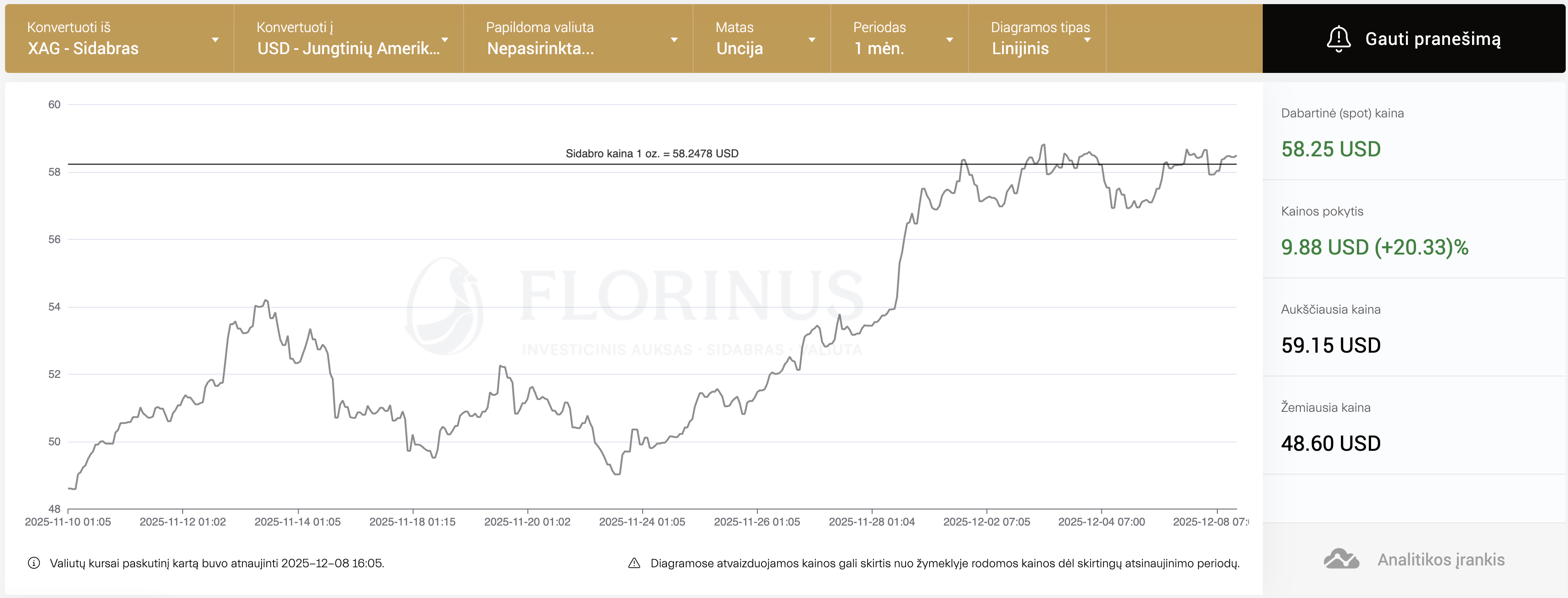 Sidabras šiuo metu yra vienas ryškiausių tauriųjų metalų rinkos veikėjų. Kainos laikosi netoli 58 USD lygio, o korekcijos išlieka sekliai. Aukso ir sidabro santykis smuko iki žemiausio taško per ketverius metus, o rinkos analitikai neatmeta galimybės, kad santykis gali grįžti prie ilgalaikio palaikymo lygio ties 65 punktų zona.