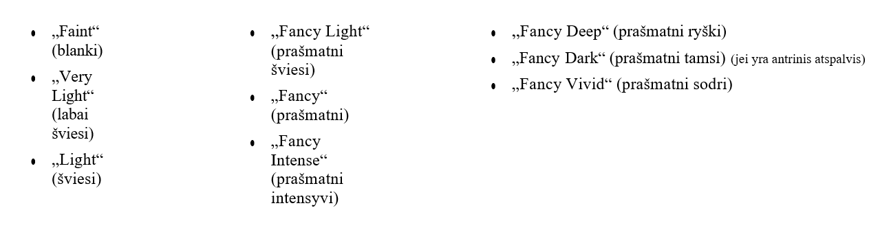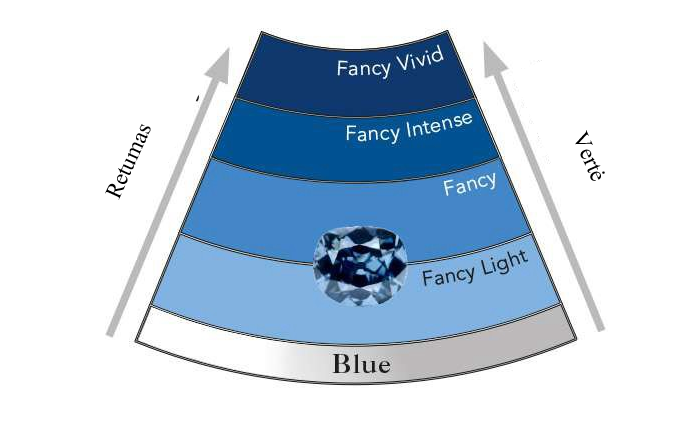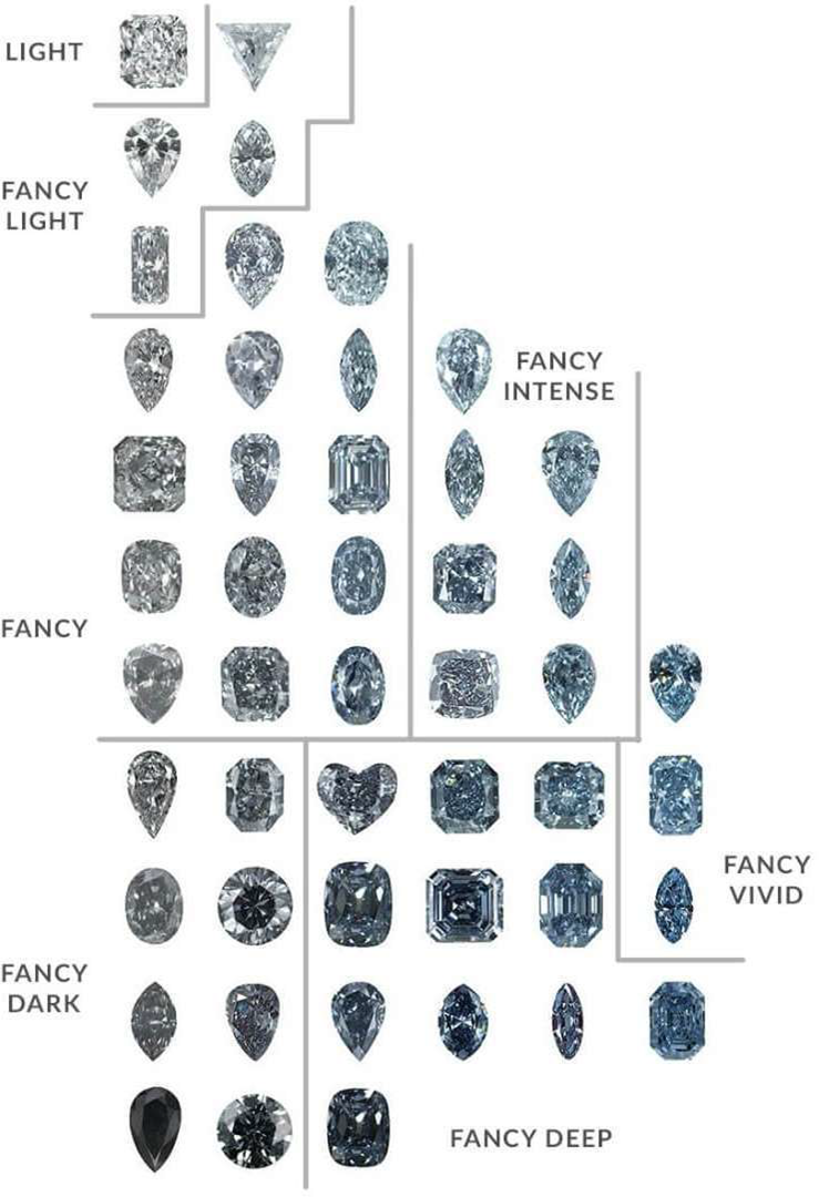 Kaip minėjome anksčiau, mėlynųjų deimantų šeima išsiskiria savo atspalviais, jų intensyvumu ir elementais, kurie ir nulemia deimantų spalvą. Žemiau pateikiame spalvinių kategorijų pavadinimus nuo mažiausio intensyvumo iki didžiausio: