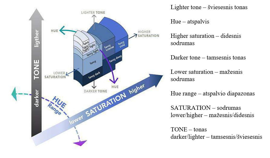 Trys pagrindiniai veiksniai, padedantys geriau suprasti prašmatnių spalvų deimantų spalvos ir vertės skirtumus, yra atspalvis, sodrumas ir tonas.