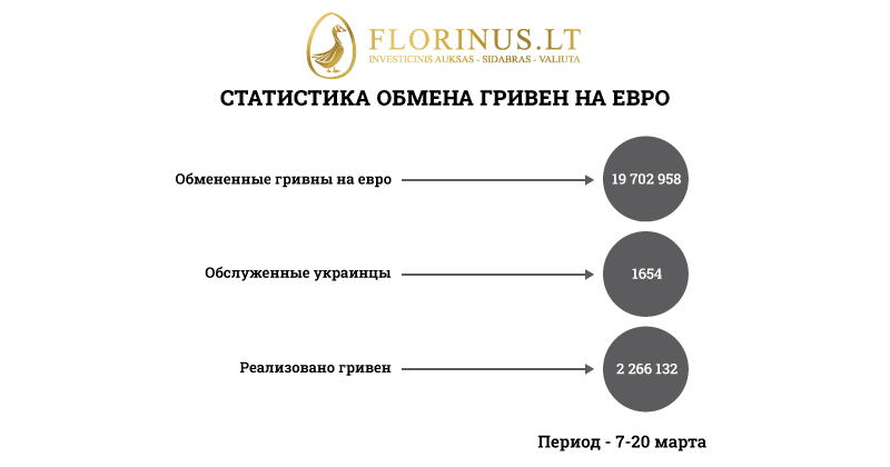 Во всех салонах “Florinus” предоставляется возможность купить желаемую сумму гривен. Эта инициатива позволит и дальше менять гривны на евро и, таким образом, помогать прибывшим в Литву украинцам. Статистика обмена валюты в салонах “Florinus” за последнюю неделюПосле начала обмена гривен на евро, 7 марта был выделен лимит в 100 тысяч евро. Однако уже вечером следующего дня, 8 марта. эта сумма была превышена. Возобновить услуги по обмену валюты помогла идея А. Тапинаса -  "Laisvės bankas". Люди не только жертвовали деньги, но и приходили обменивать евро на гривны, чтобы как можно быстрее реализовать их и возобновить их обмен.