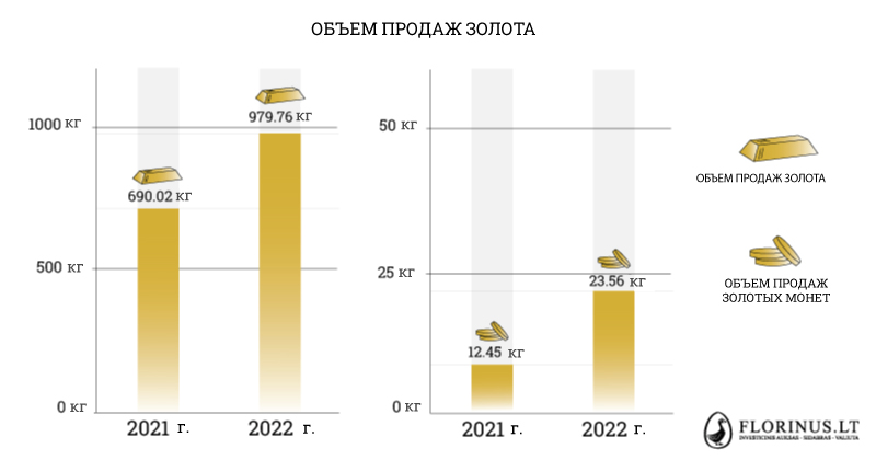 В эксклюзивном отчете UAB Florinus видно, что золото в 2022 году продано на 300 килограммов больше, чем в 2021. В прошлом году всего было продано 1003,33 килограмма золота, в том числе 979,76 килограмма золотых слитков, что составляет более 38 тысяч единиц и 23,56 килограмма золотых монет - более 6 тысяч единиц. Всего за последние два года было продано почти 2 тысячи килограммов золота.