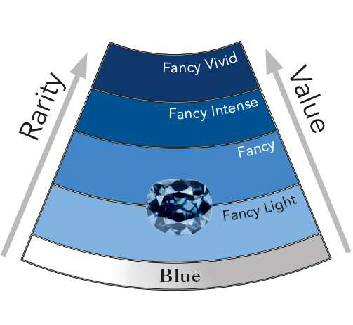 Как мы упоминали ранее, семейство голубых бриллиантов отличается оттенками, интенсивностью и элементами, определяющими цвет бриллиантов. Ниже приведены названия цветовых категорий от самой низкой интенсивности до самой высокой: